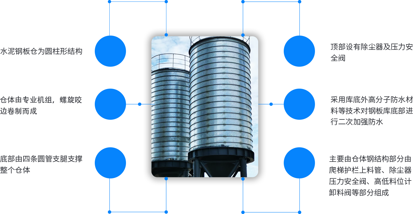 鋼板庫基礎及庫底所用的混凝土全采用防水、防滲混凝土。解決水泥在鋼板庫內的完全出料問題